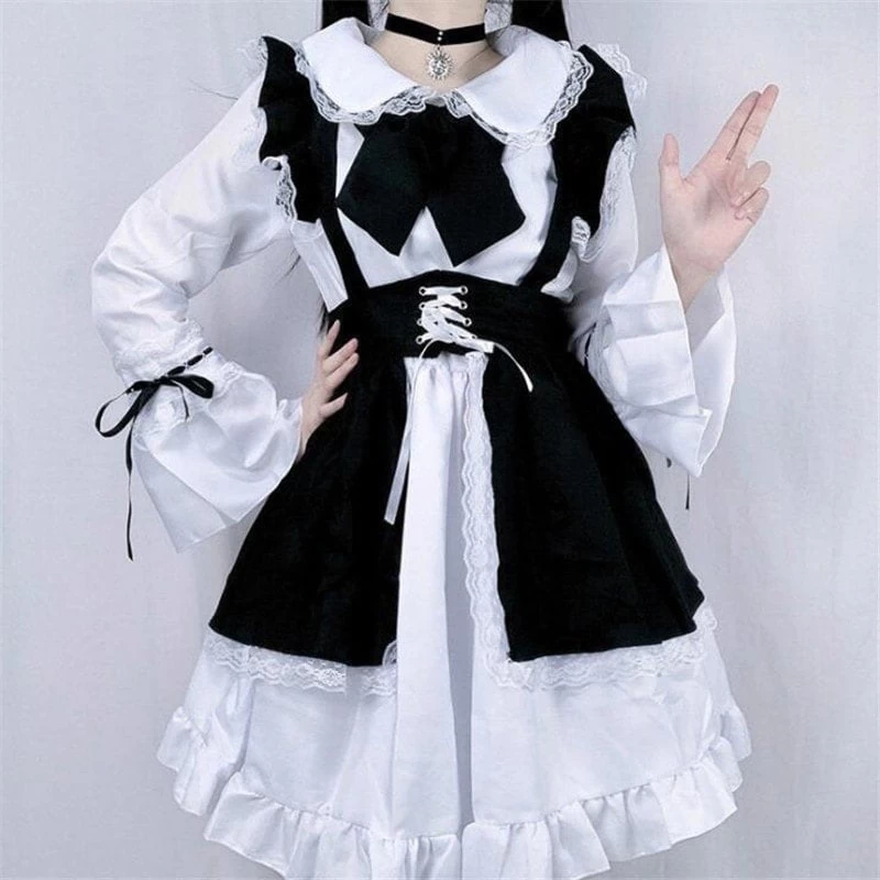 1 * Black and White Unisex Bow Ruffle Maid Lolita Dress