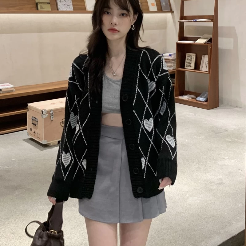 This stunning cardigan features a grunge heart and argyle pattern that is perfect for Autumn and Winter. The love embroidery adds a touch of romance, while the loose fit ensures maximum comfort. Layer this cardigan over your favorite outfits to stay warm and stylish all season long.