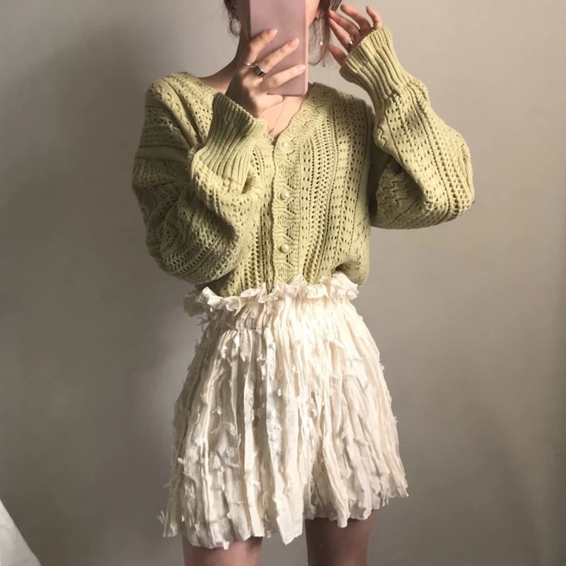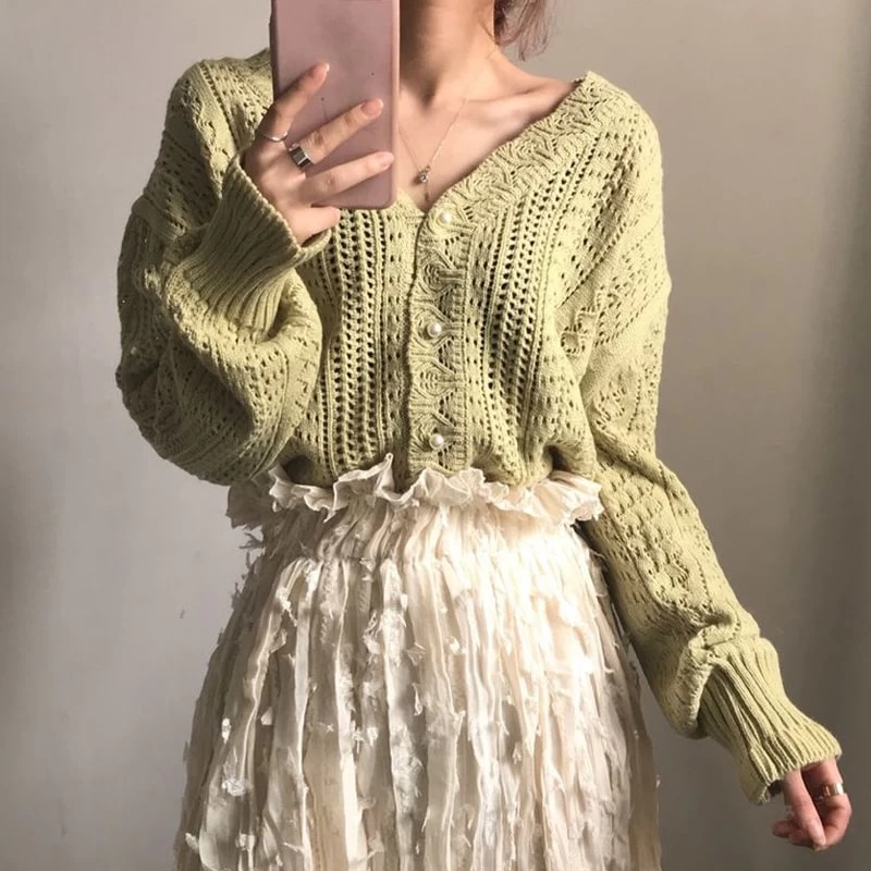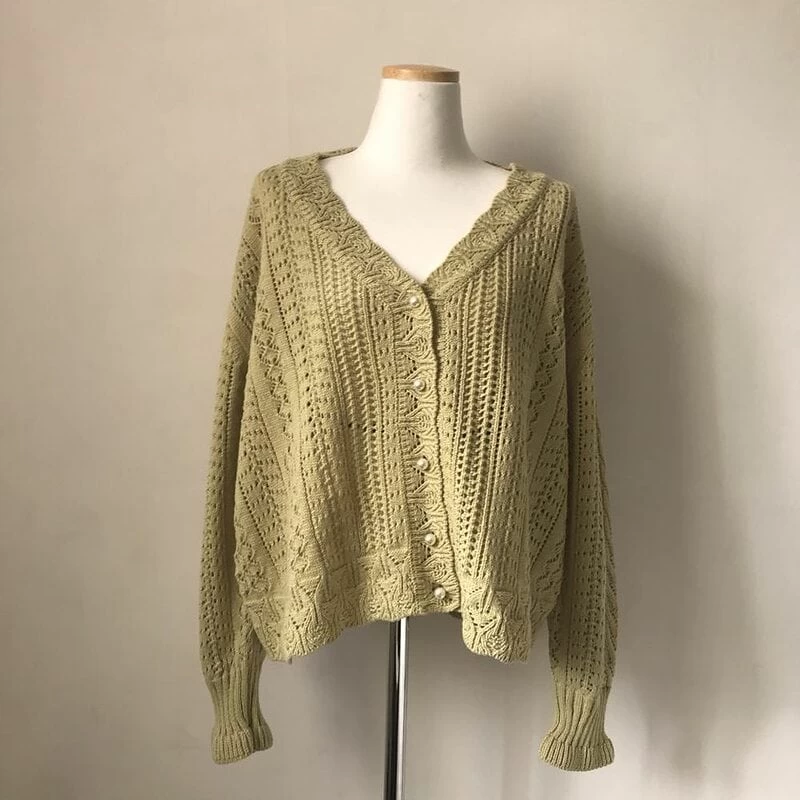 This knit cardigan is the perfect addition to your autumn wardrobe. The soft, lightweight fabric will keep you cozy all season long. The V-neck and long sleeves add a touch of style, while the geometric print gives you a modern edge. Plus, the hollow-out design makes this sweater unique and eye-catching.