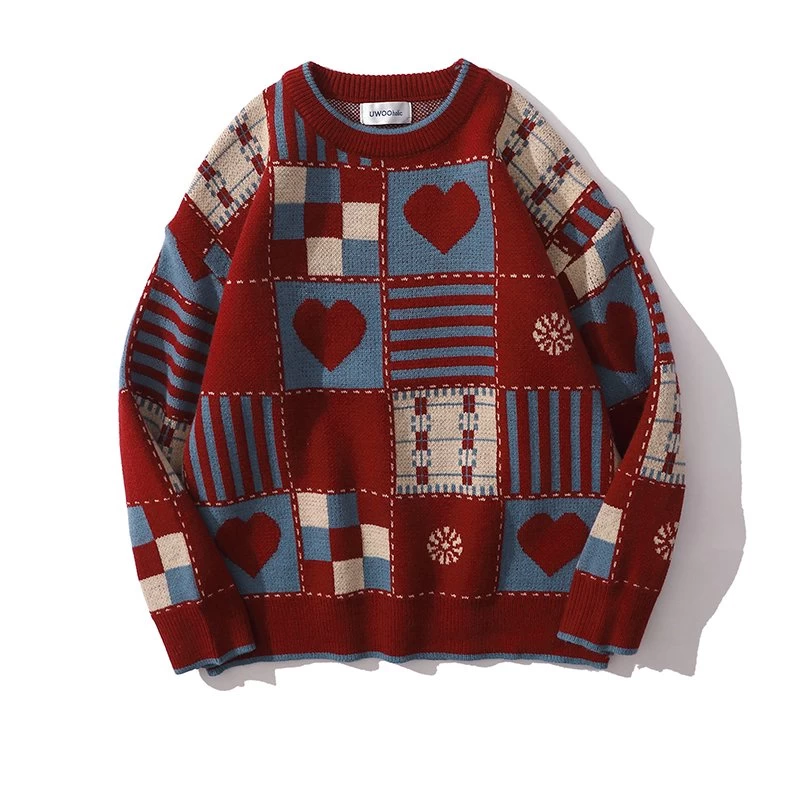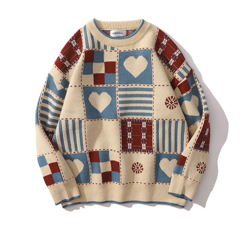 Style: Plaid Love Round Neck Knitted Sweater