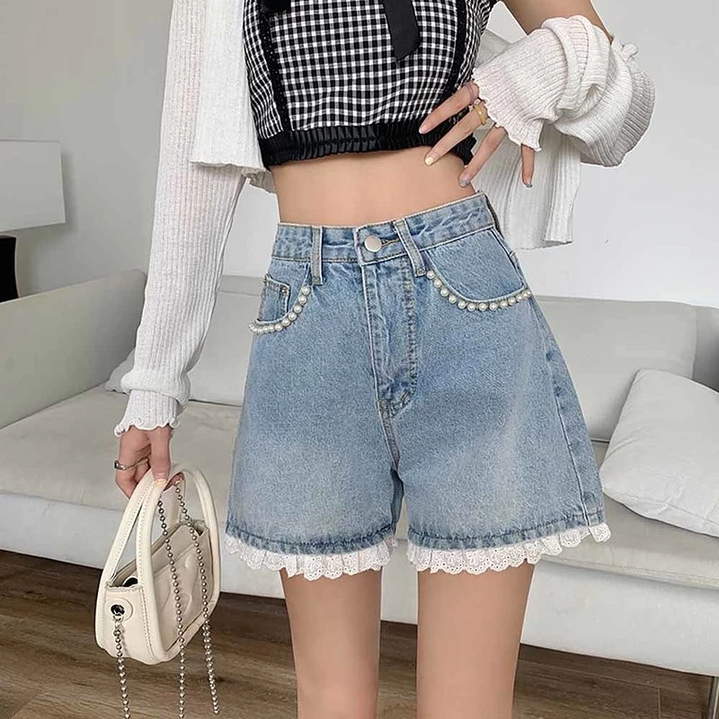 1 * Kawaii Beaded Lace Hem Denim Shorts