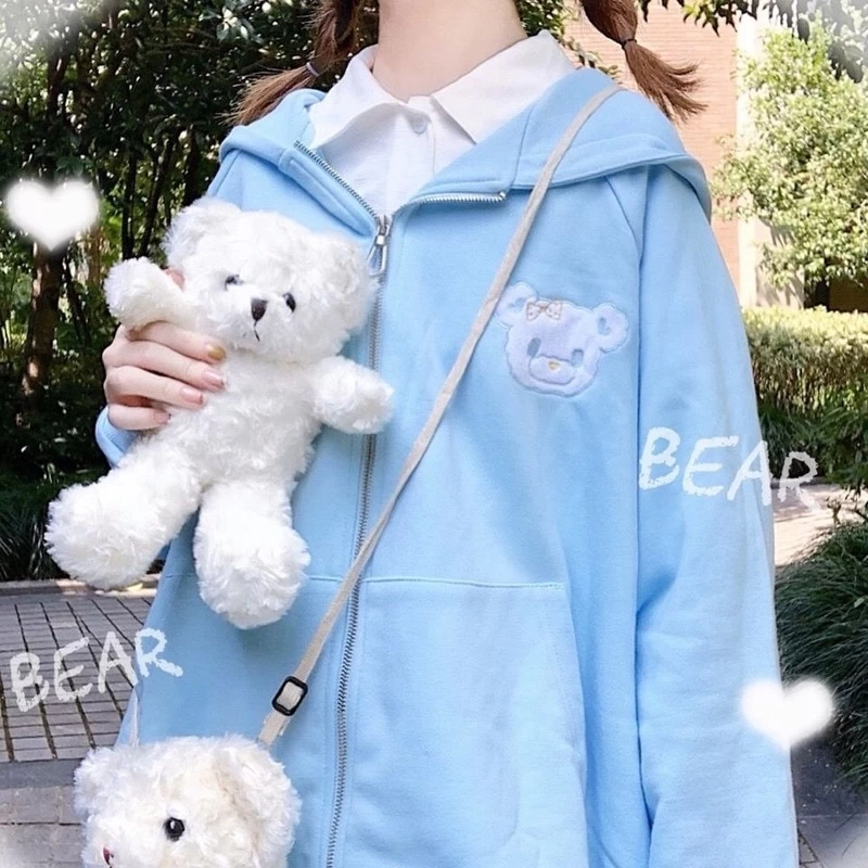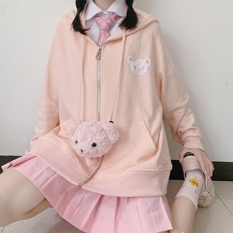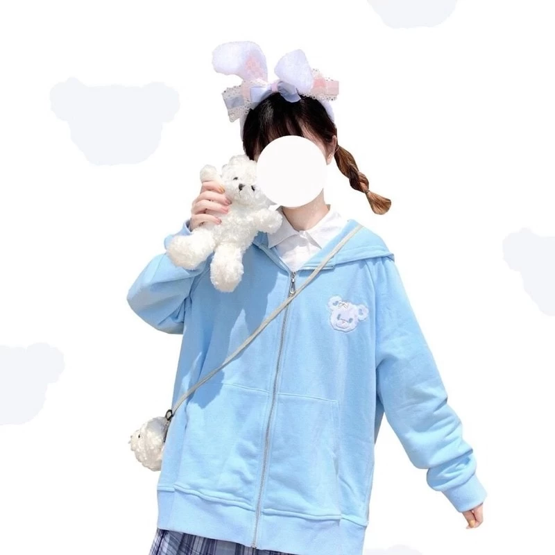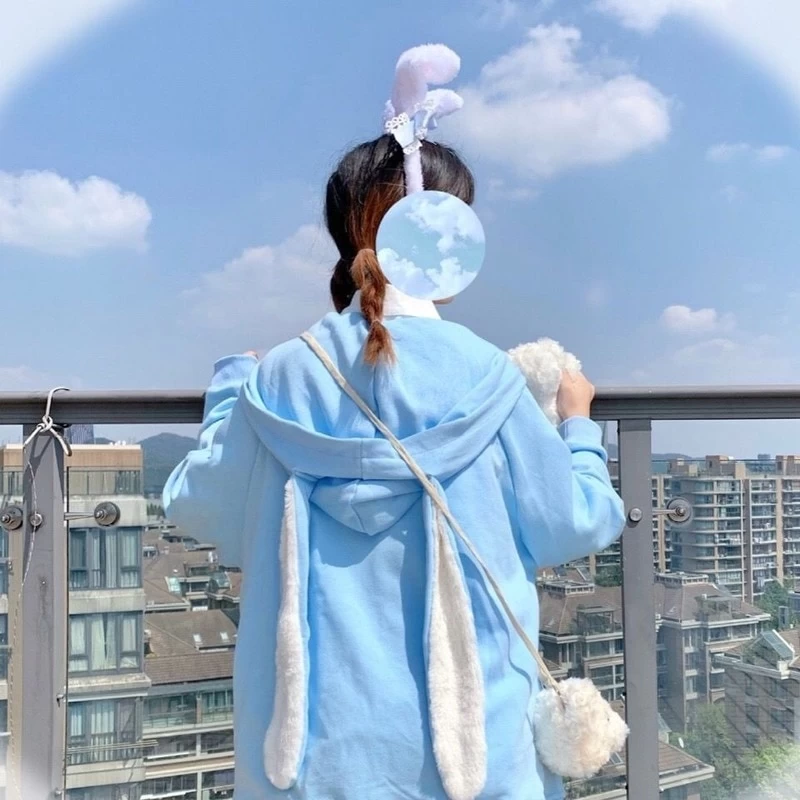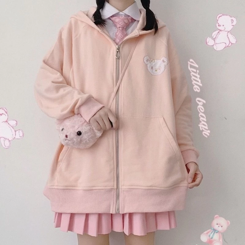 This is the Kawaii Bunny Ears Hoodie for all your cozy winter needs! You’ll love our new zip-up sweatshirt with a cuddly bunny ears design in a soft pink color. The long sleeves and hood will keep you warm through all of those cold winter months. This hoodie can even be worn as just an oversize shirt, so it’s versatile throughout the seasons. For colder days, wear this Hoodie under our matching tracksuit or skirt for additional warmth!