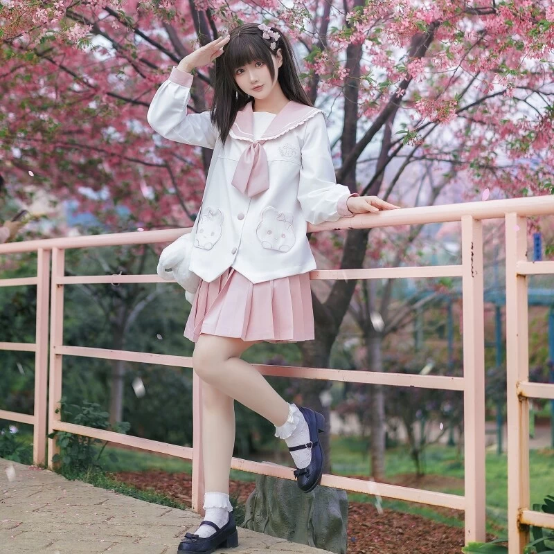 1 * Kawaii Pink Cartoon Rabbit Embroidered JK Uniform Skirt Suit(1 * Uniform T shirt / 1 * JK skirt/ 1 * Bow tie)
