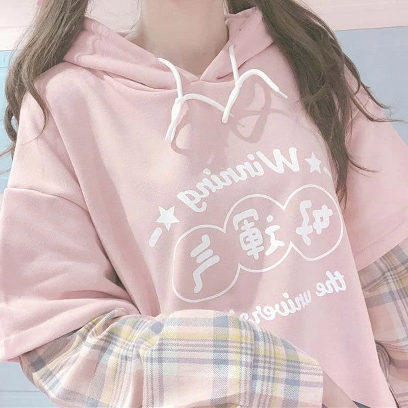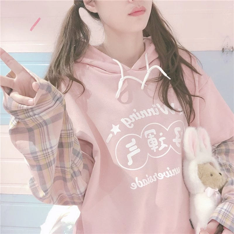 This Kawaii Pink Long Sleeve Fake Two Piece Hoodie is perfect for any fashion-savvy woman who wants to make a statement. The Kawaii hoodie features a soft, pink plaid fabric with long sleeves and a kawaii letter design on the front. The Kawaii Pink hoodie is also lined with a fluffy, pink fabric for added warmth and comfort.