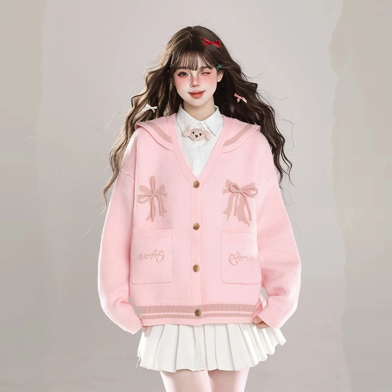Kawaii Pink Navy Collar Cardigan Sweater: Embrace cozy elegance with this sweet, loose-fit cardigan featuring a charming bowknot design. Perfect for autumn!