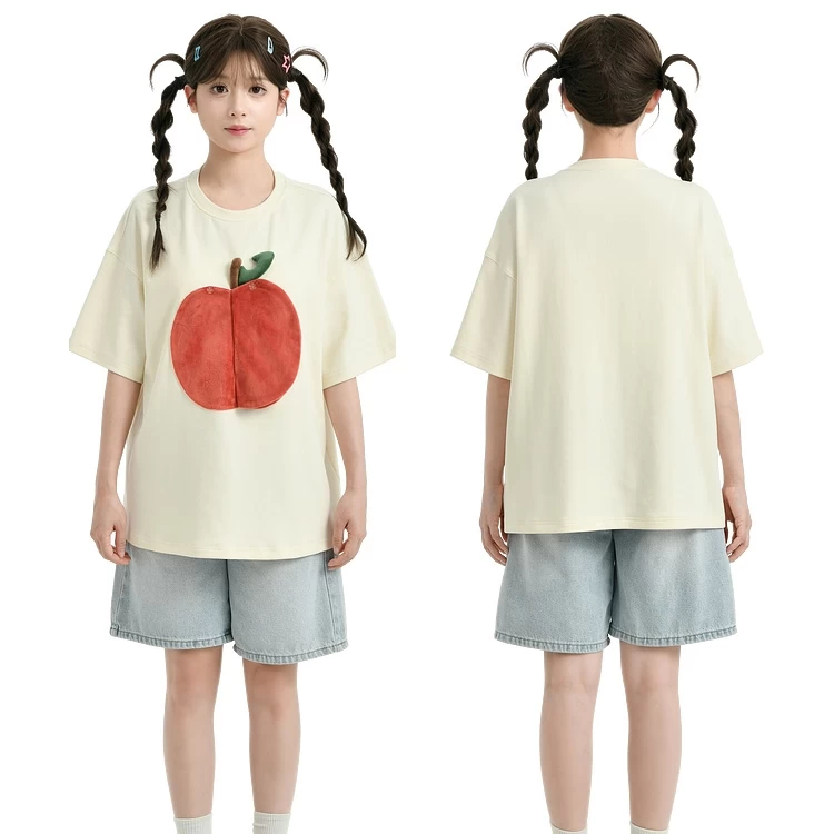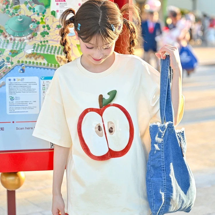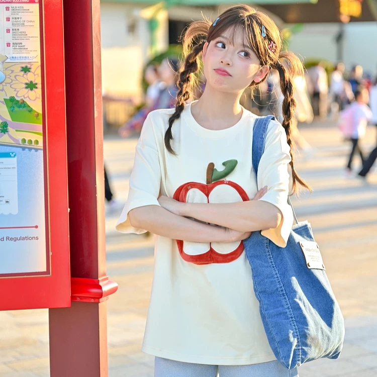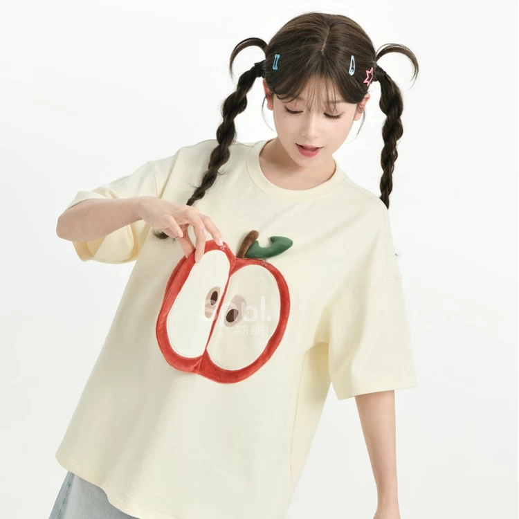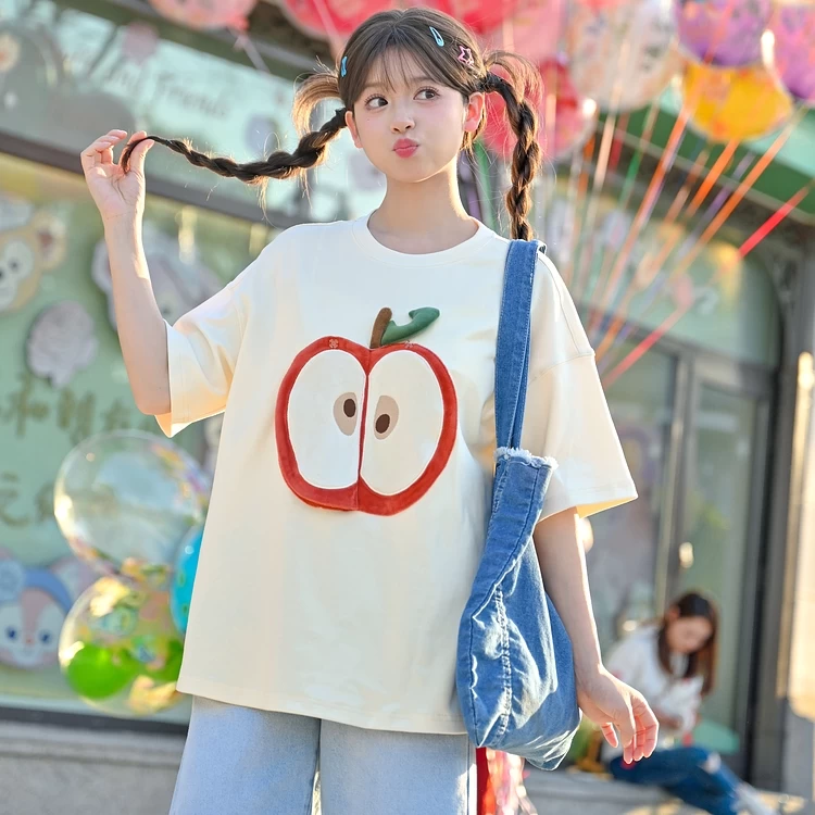 Introducing the Kawaii Summer Cartoon Page Flip Apple T-Shirt, a whimsical and adorable addition to your summer wardrobe that is sure to turn heads! Imagine wearing a shirt featuring an apple tree that can turn pages, creating a fun and unique visual experience. Made from a blend of 95% cotton and 5% spandex, this Kawaii t-shirt offers both comfort and stretch for all-day wear during the hot summer months.