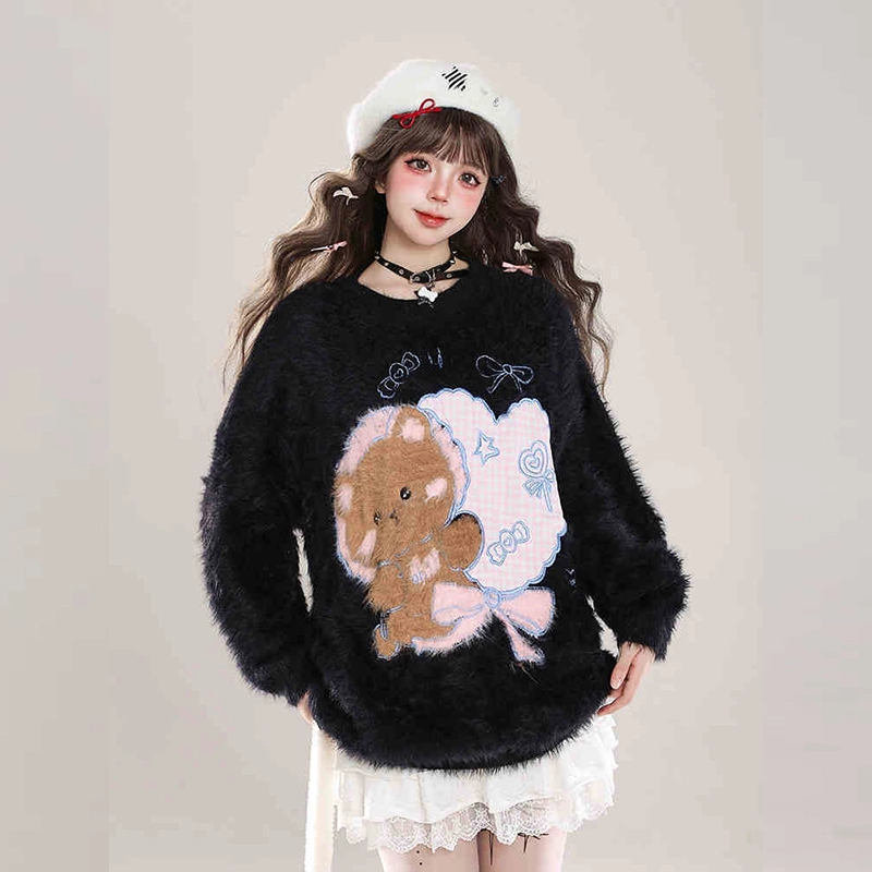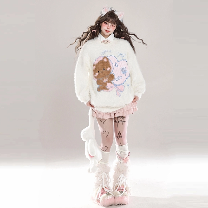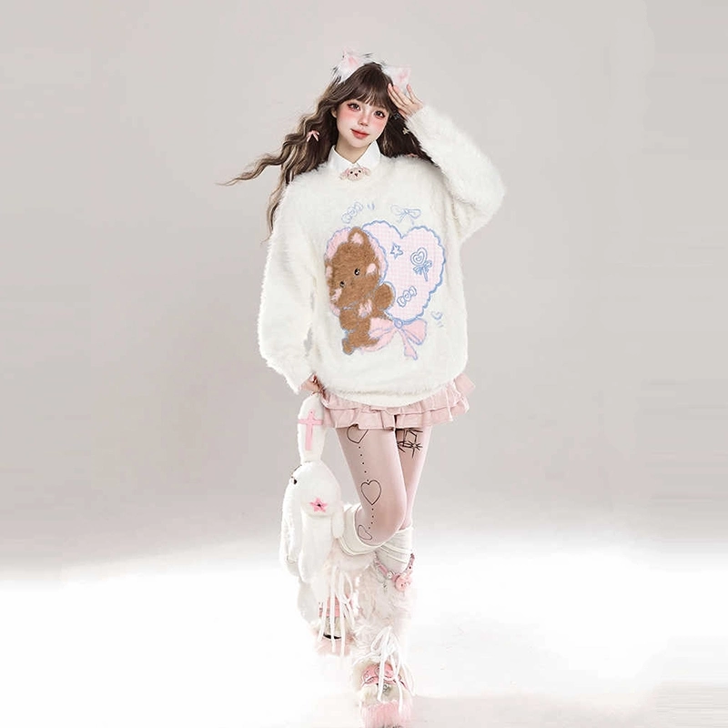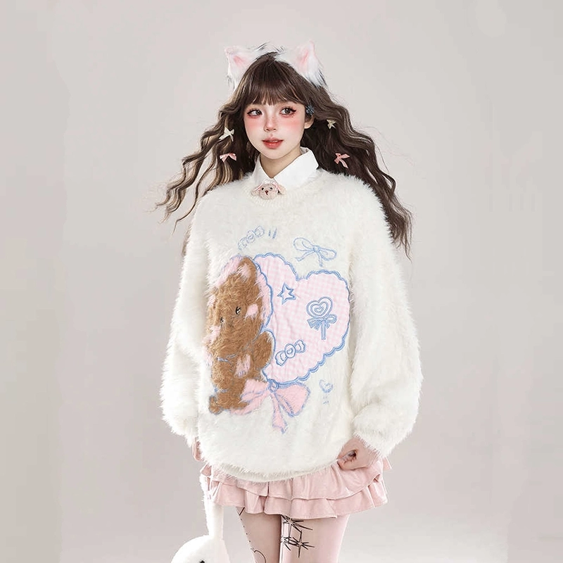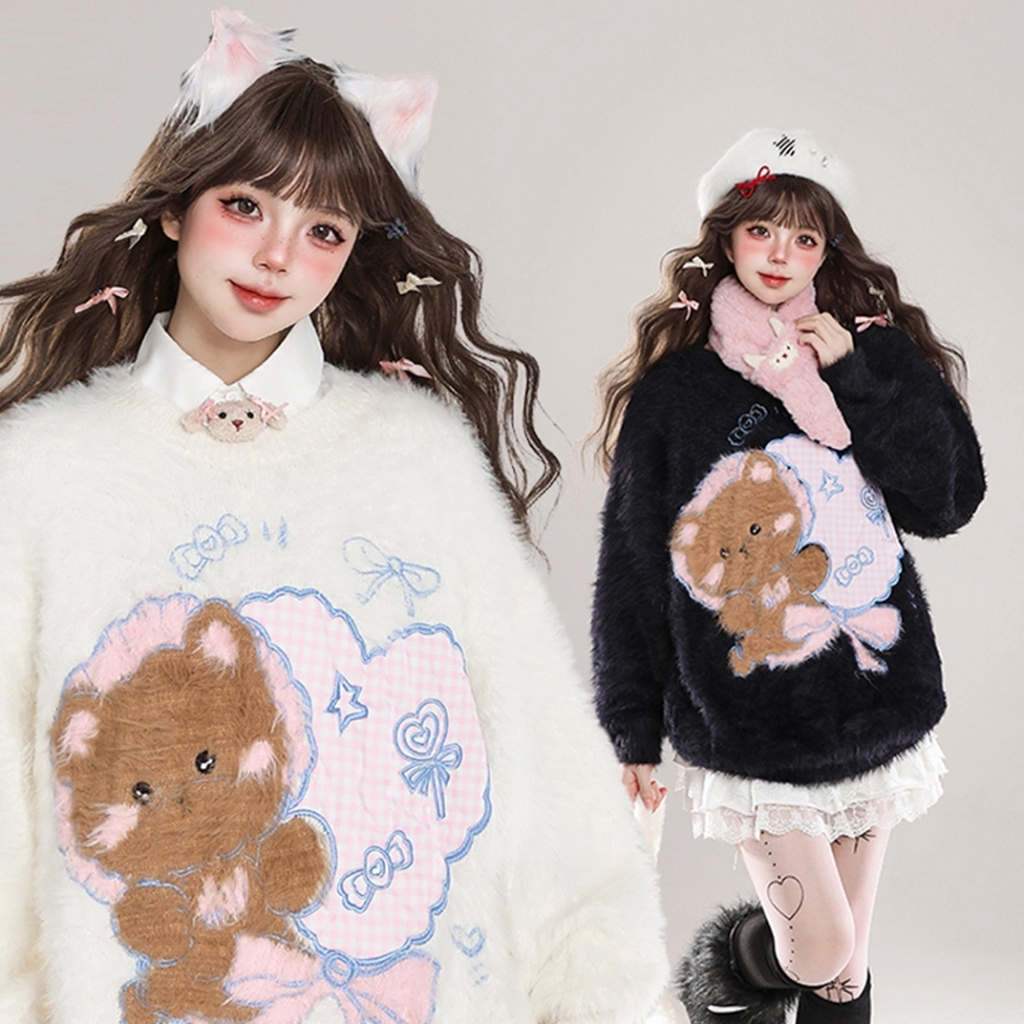 Embrace the cozy charm of autumn and winter with our Kawaii Sweet Girl Style Cute Bear Round Embroidery Pullover Sweater, designed for those who appreciate both comfort and cuteness. This delightful mohair sweater features an adorable embroidered bear motif that adds a playful touch to your wardrobe, making it perfect for casual outings or lazy days at home. The loose fit allows for easy layering over your favorite tops while ensuring a relaxed silhouette that flatters all body shapes.