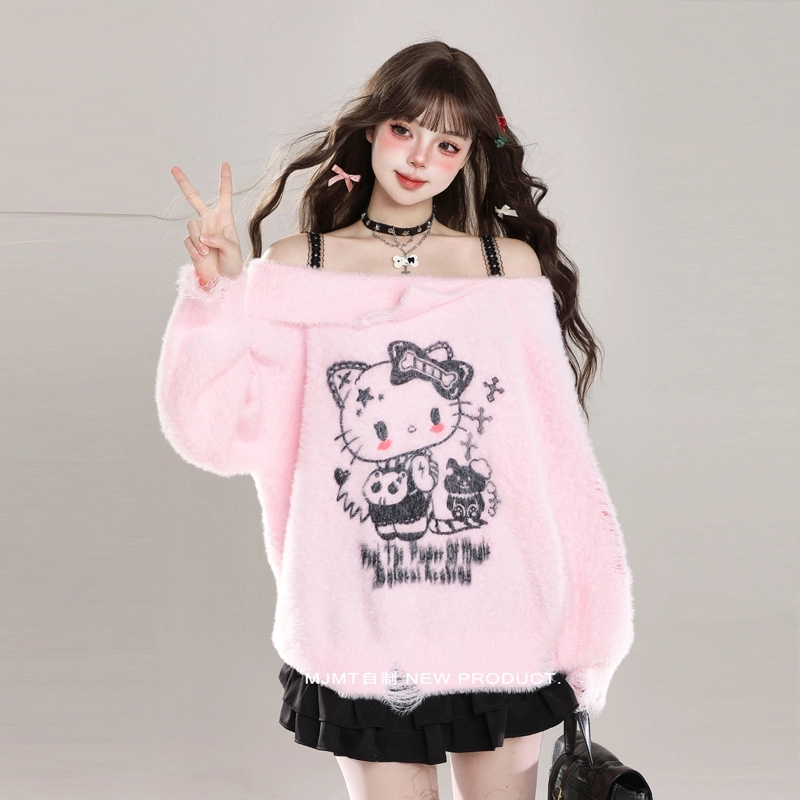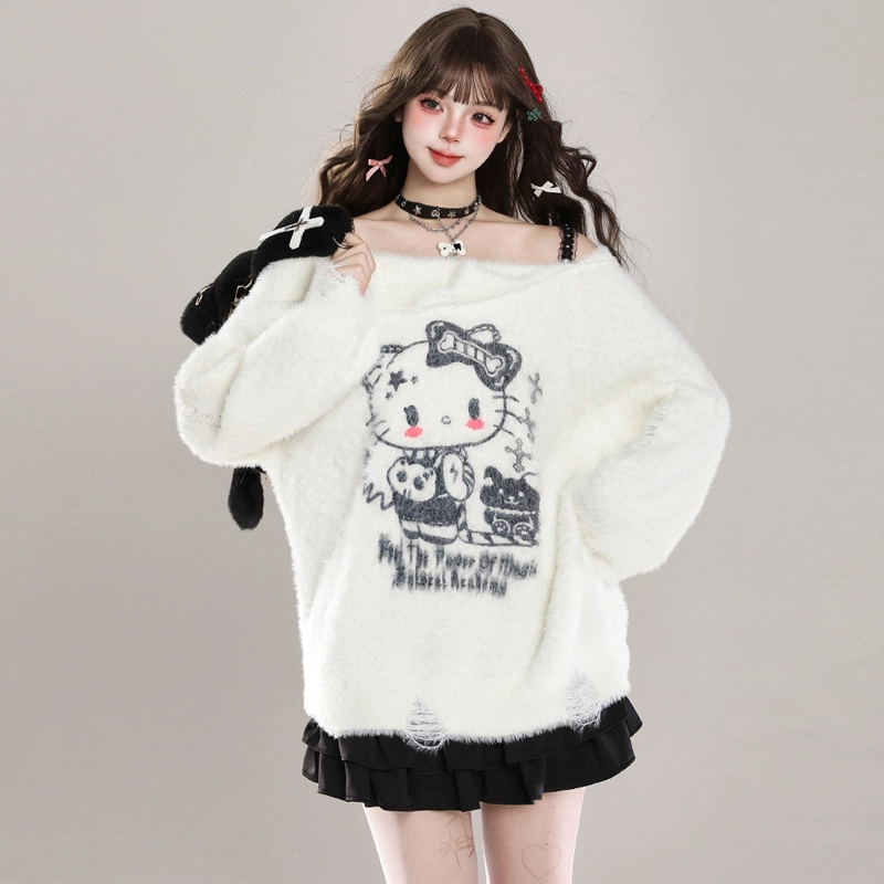 1 * Kawaii Sweet Girl Style Hello Kitty Print Off-Shoulder Sweater