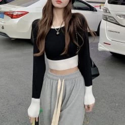 This Cute Double Color Short Sweater is a Korean Style Contrast Color Stitching Long-sleeved T-shirt Women 2022 Spring New College Style Tight-fitting All-match Shirt. It is very stylish and looks great on anyone. The double-color stitching makes it unique and stands out from the rest. It is made of high-quality materials and will last long.