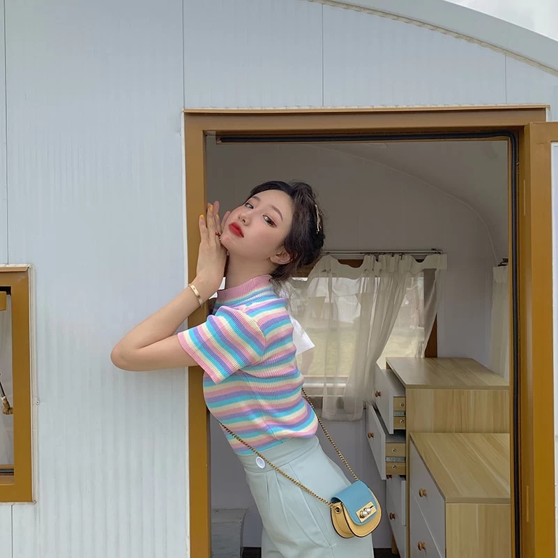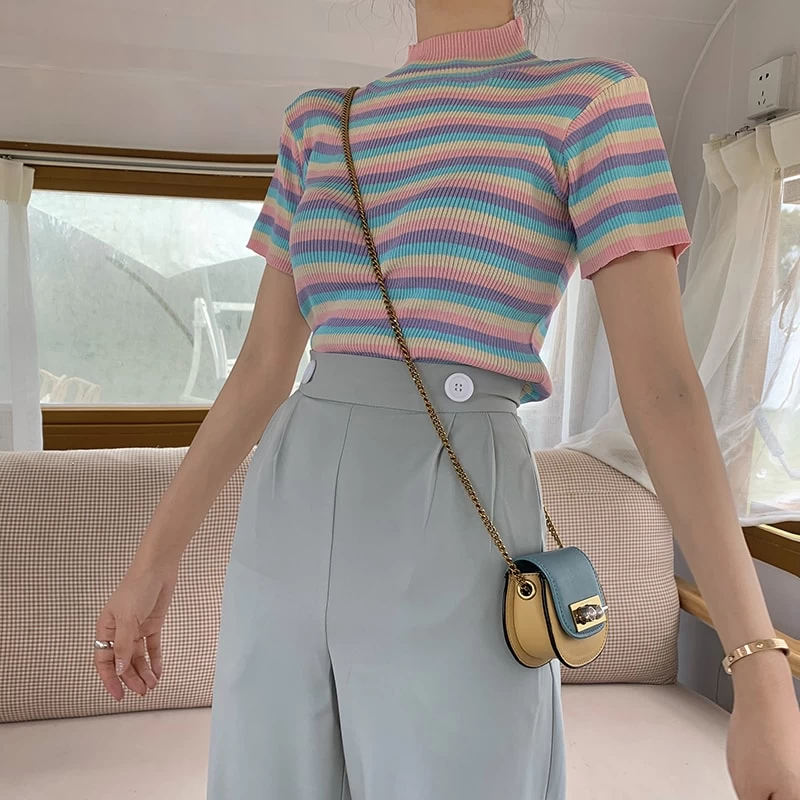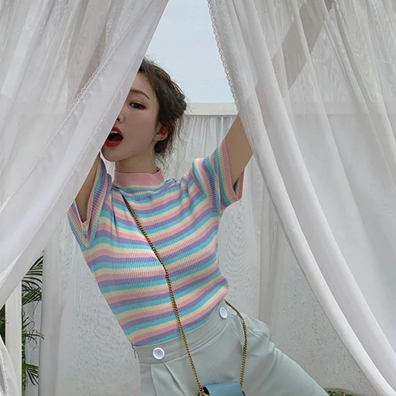 This Kawaii T-shirt is perfect for any woman who wants to feel fashionable and stylish. The Korean Fashion Sweet Rainbow Striped Short T-shirt is a must-have for your summer wardrobe. It’s comfortable and slim-fitting, and the colors are absolutely gorgeous. You can wear it with jeans, shorts, or a skirt; it’s versatile and easy to style. Plus, the quality is excellent – you’ll be able to wear this shirt for many summers.