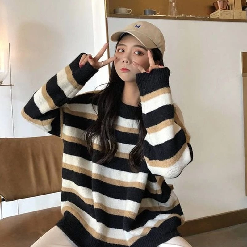This Korean Striped Loose Sweater is the perfect addition to your winter wardrobe! The soft and cozy fabric will keep you warm all winter long, while the stylish stripes add a touch of personality. Whether you’re headed to class or out for a coffee date, this sweater will keep you looking chic and comfortable.