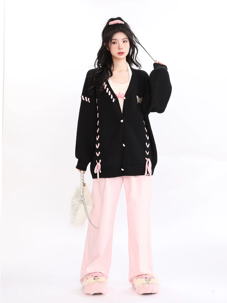1 * Lazy Style Black Pink Love Knit Cardigan