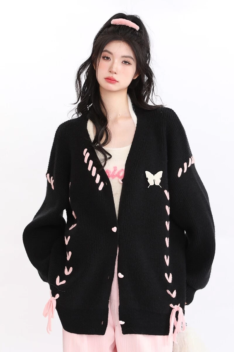 Unleash your true style with our new Lazy Style Black Pink Love Knit Cardigan. This unique piece perfectly encapsulates the effortless chic of the lazy style, making it a must-have for any fashion-forward woman. With its versatile design and attractive butterfly strap, this cardigan can easily elevate any ensemble from casual to sophisticated.