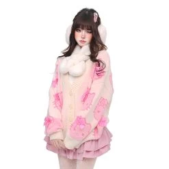 Sweet Soft Girl Style Pink Hello Kitty Printed Cardigan Sweater