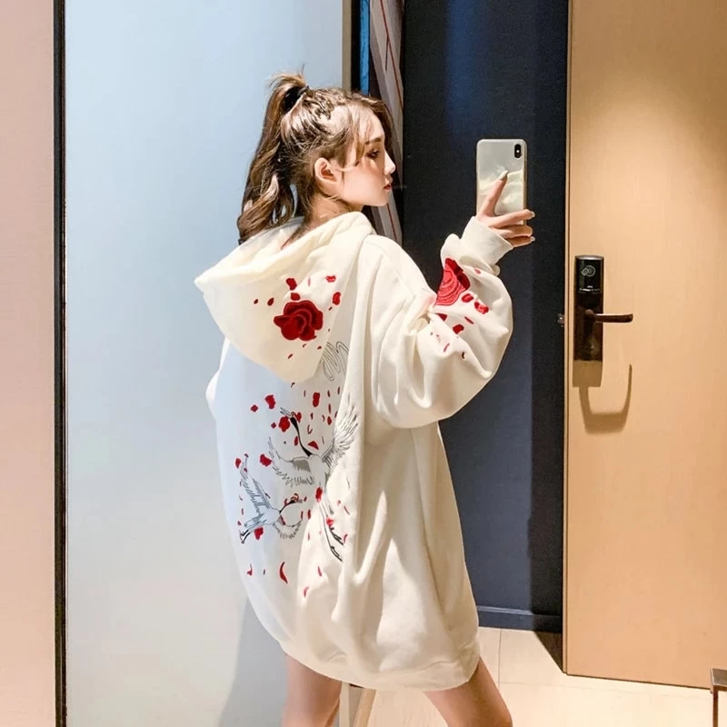 This Rose Loose Fit Hoodie is perfect for keeping you warm in the colder months. The soft velvet material and embroidered design make it a stylish and comfortable choice. The loose fit allows you to move easily, and the Kawaii hood provides extra warmth when needed.