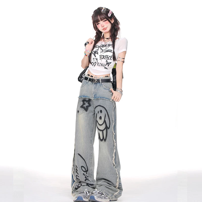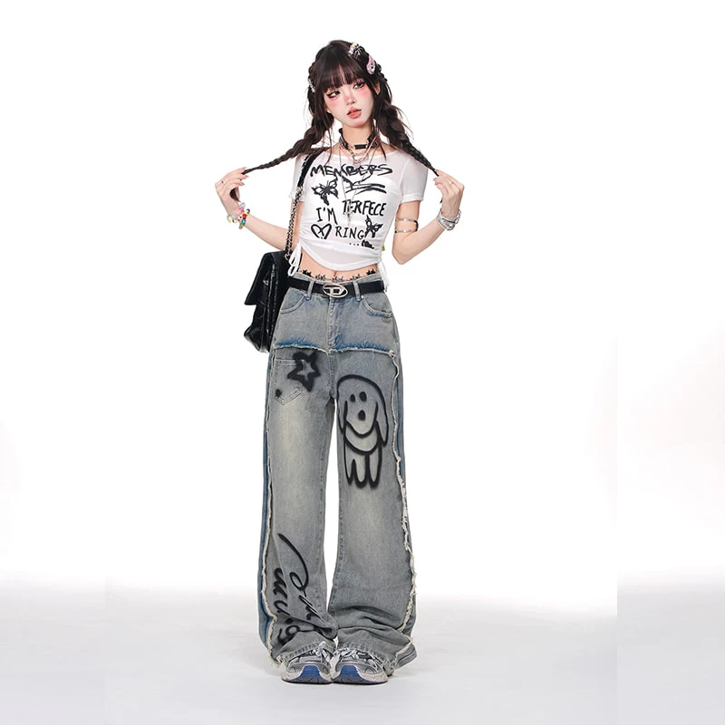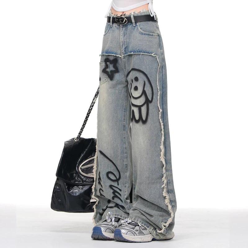 1 * Summer Blue Cartoon Puppy Graffiti Print Wide-leg Jeans