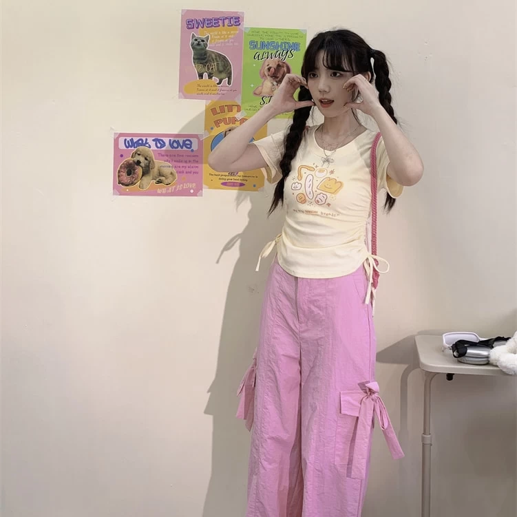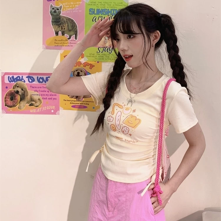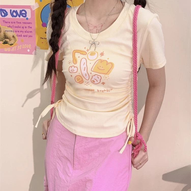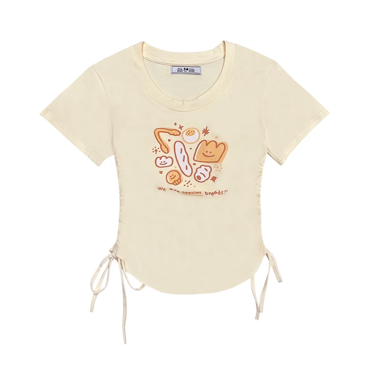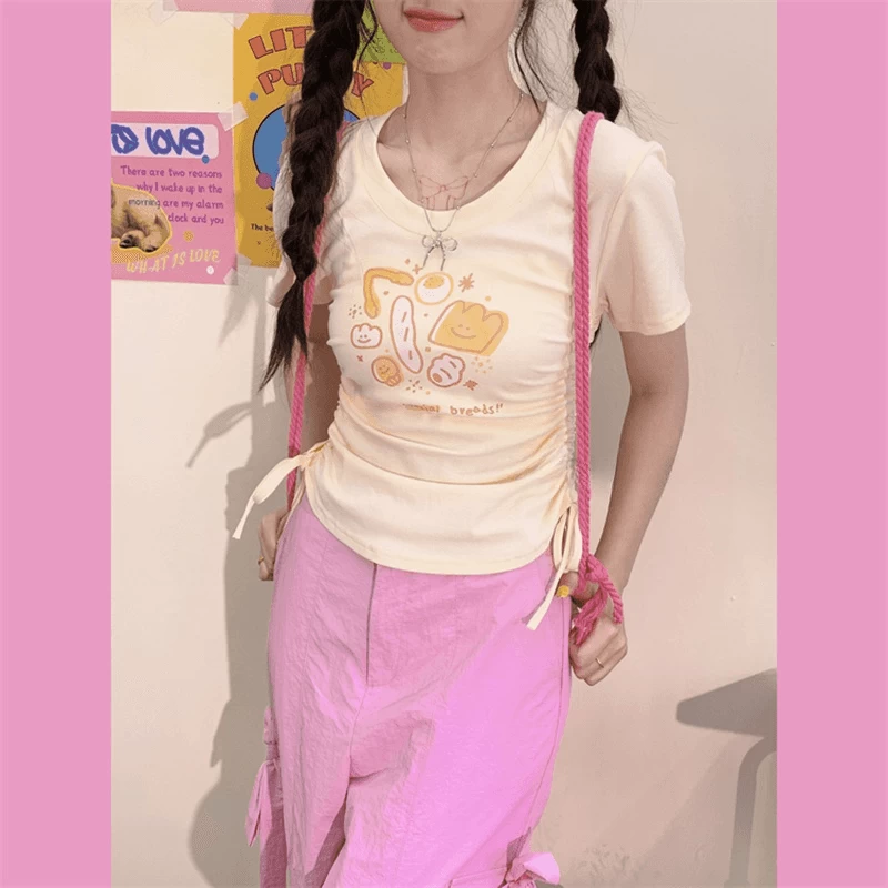 1 * Summer Sweet Girl Style Apricot Cartoon Cheese Print T-shirt