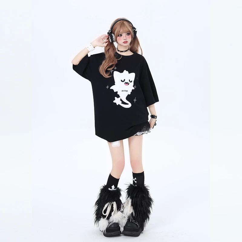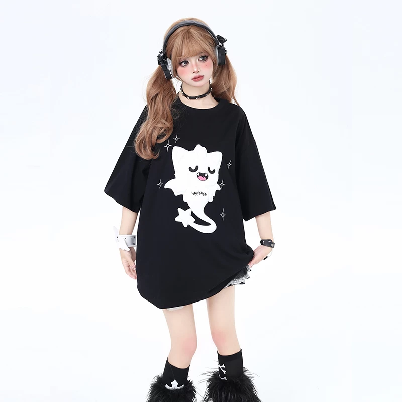 Embrace the spirit of summer with playful charm in our Summer Sweet Girly Style Cartoon Ghost Cat Print T-shirt. This delightful piece blends whimsy and comfort, making it a perfect addition to your warm-weather wardrobe. Crafted from 100% cotton, this Kawaii T-shirt promises breathability and softness that will keep you cool and comfortable throughout the day. Its unique cartoon ghost cat print adds a touch of fun girly flair, ensuring you stand out in any crowd.