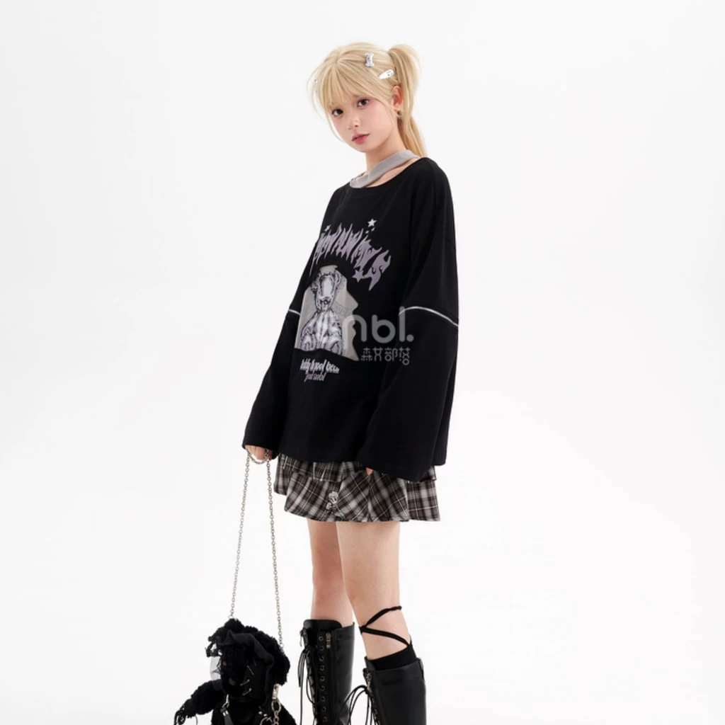 1 * Sweet Cool Girl Style Black Cartoon Bear Print Long Sleeve T-shirt