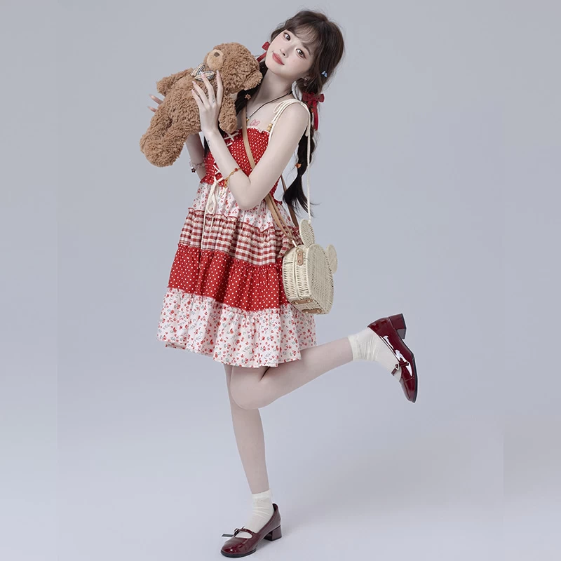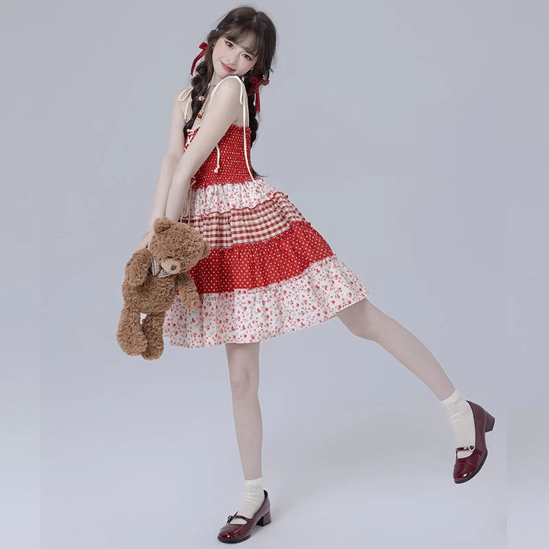 1 * Sweet Girl Style Red Floral Suspender Dress