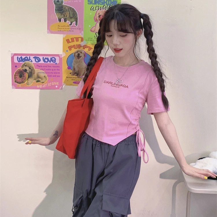 Step into the vibrant world of Y2K fashion with our Sweet Y2K Style Pink Slim Short T-shirt—a must-have for any trendy wardrobe! This delightful piece channels the fun and flirty essence of early 2000s style, featuring a playful irregular drawstring design and an adorable bow tie that adds a touch of whimsy. Crafted from soft, breathable cotton, this top is perfect for those warm summer days when comfort meets chic.